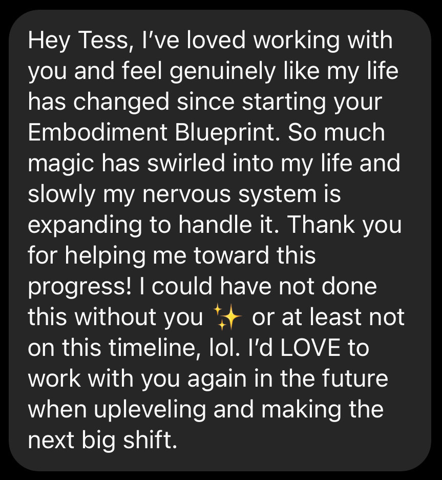 "Working with Tess has been life changing. She has an innate ability to read patterns and energetics, helping me work through my biggest blocks. Her Embodiment Blueprint is one of the most effective tools to build and live the higher version of myself. I can't thank her enough for her work."