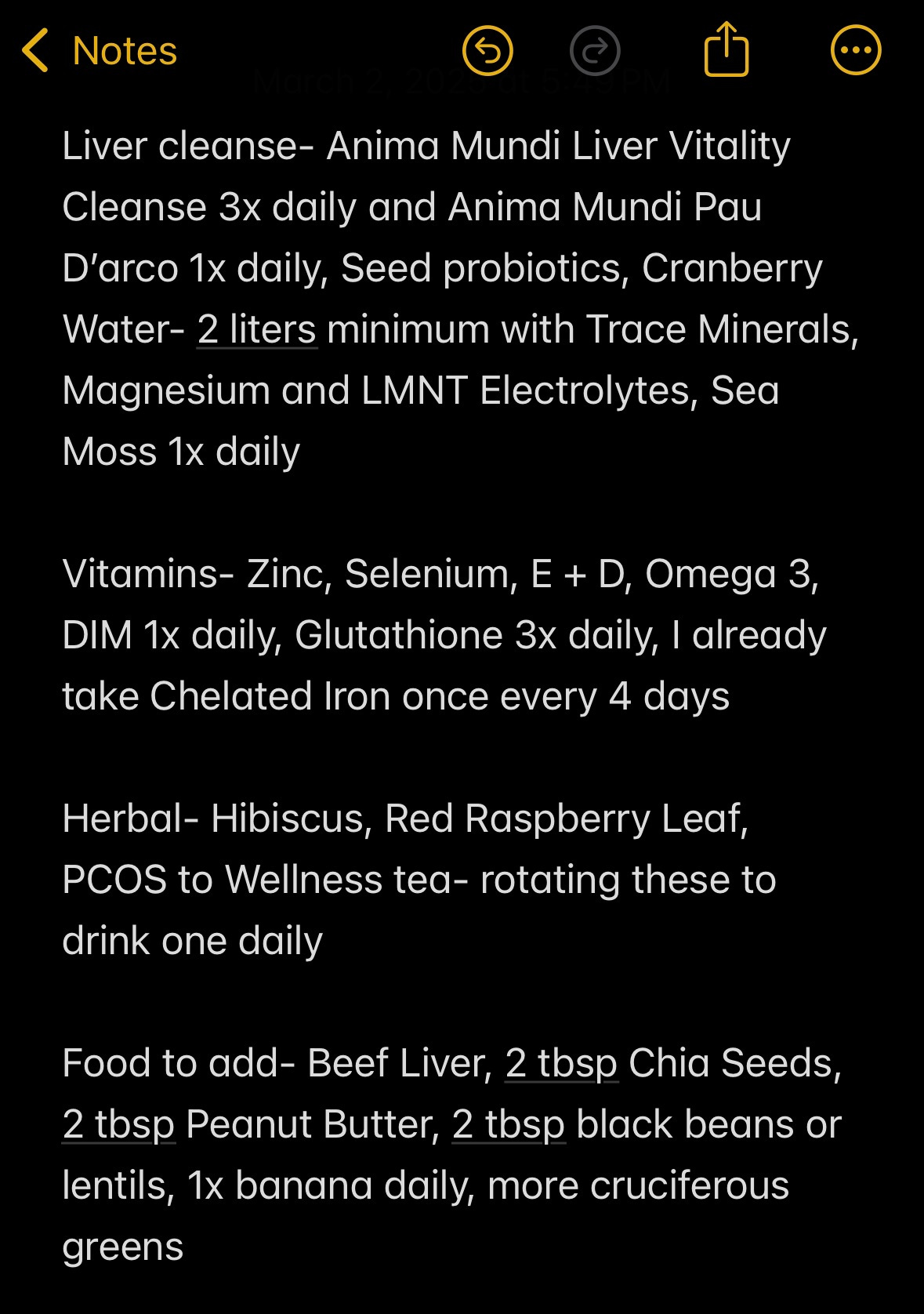 I reiterate- this is not medical advice, and this is a protocol I created for my body and specific circumstances. I am pulling from the information I received on my BioScan, past blood work, and wisdom from attending Nutrition School. That being said, I share this in case it sparks or inspires something within yourself.